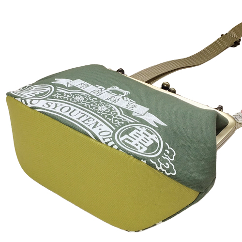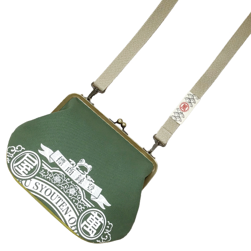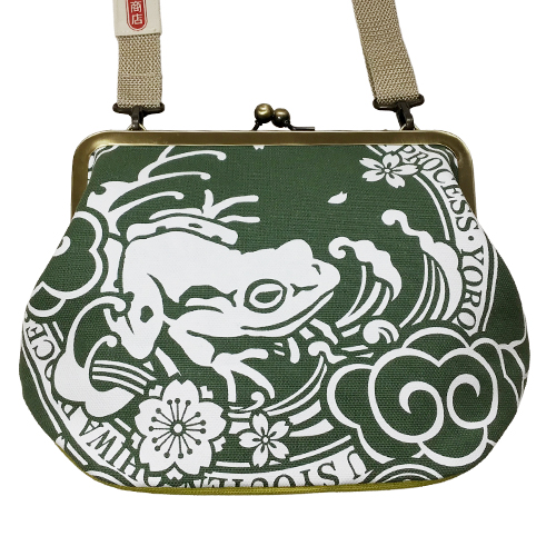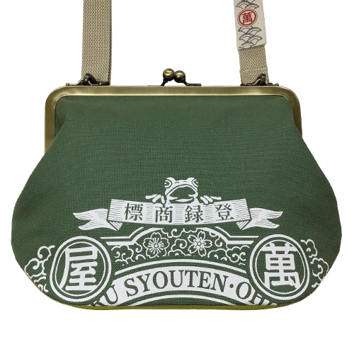 萬屋蛙商店 がま口バッグ ラベル柄 緑 マチヒワ 2026年1月23日 ¥11,500(税別) 1点在庫有り 内布は萬屋蛙商店オリジナル生地使用 肩紐にもさりげなく萬屋蛙商店マークが! サイズ 約h19xw28xマチ10㎝ 口金幅21.5cm 紐の長さ 最長120cm 袋 綿100% 肩紐PP 底板 発泡ポリエチレン